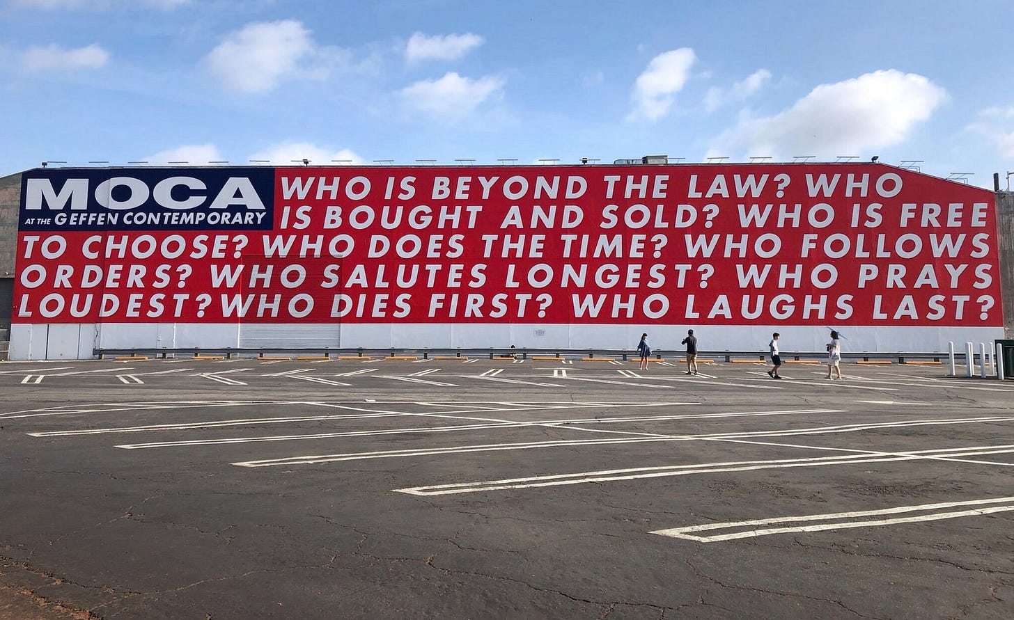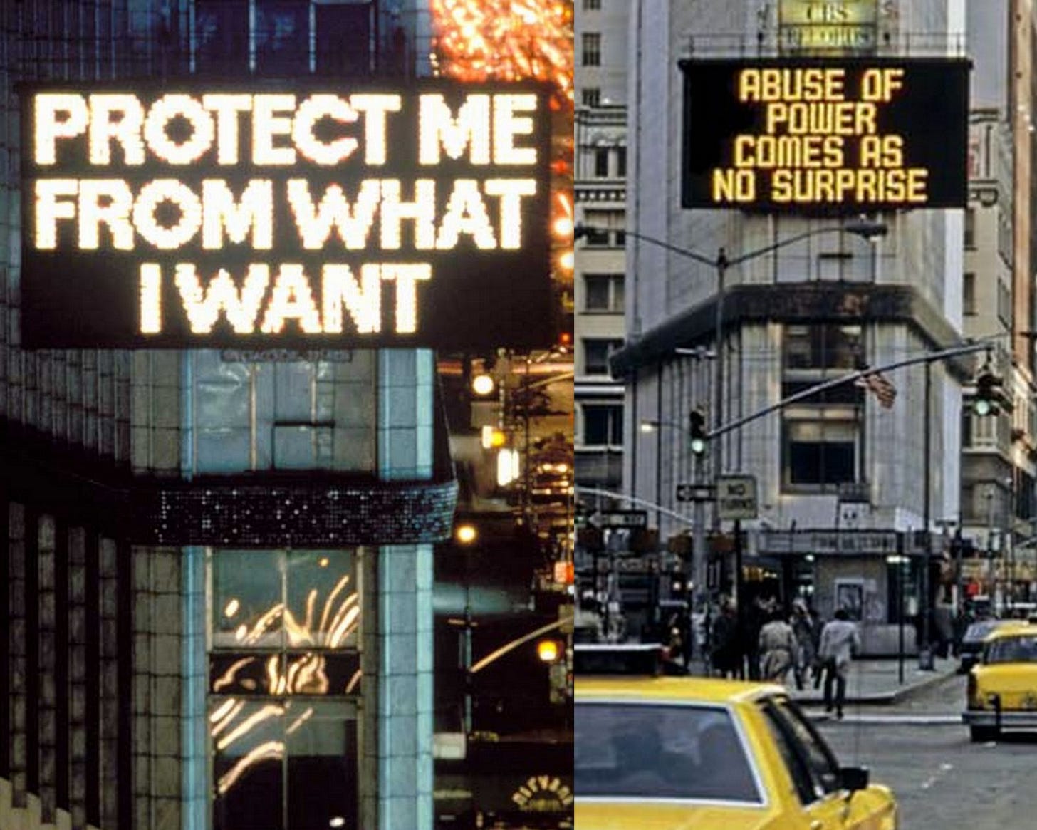 The dark mirror of our time is often best expressed in the art of two artists who have been creating Truisms since the 1970s. While we are swimming in words and slogans these days, these women initiated the trend with razor-sharp messaging. At first, it was on small prints and plaques. Their success has invited offers to present their words in large-scale installations