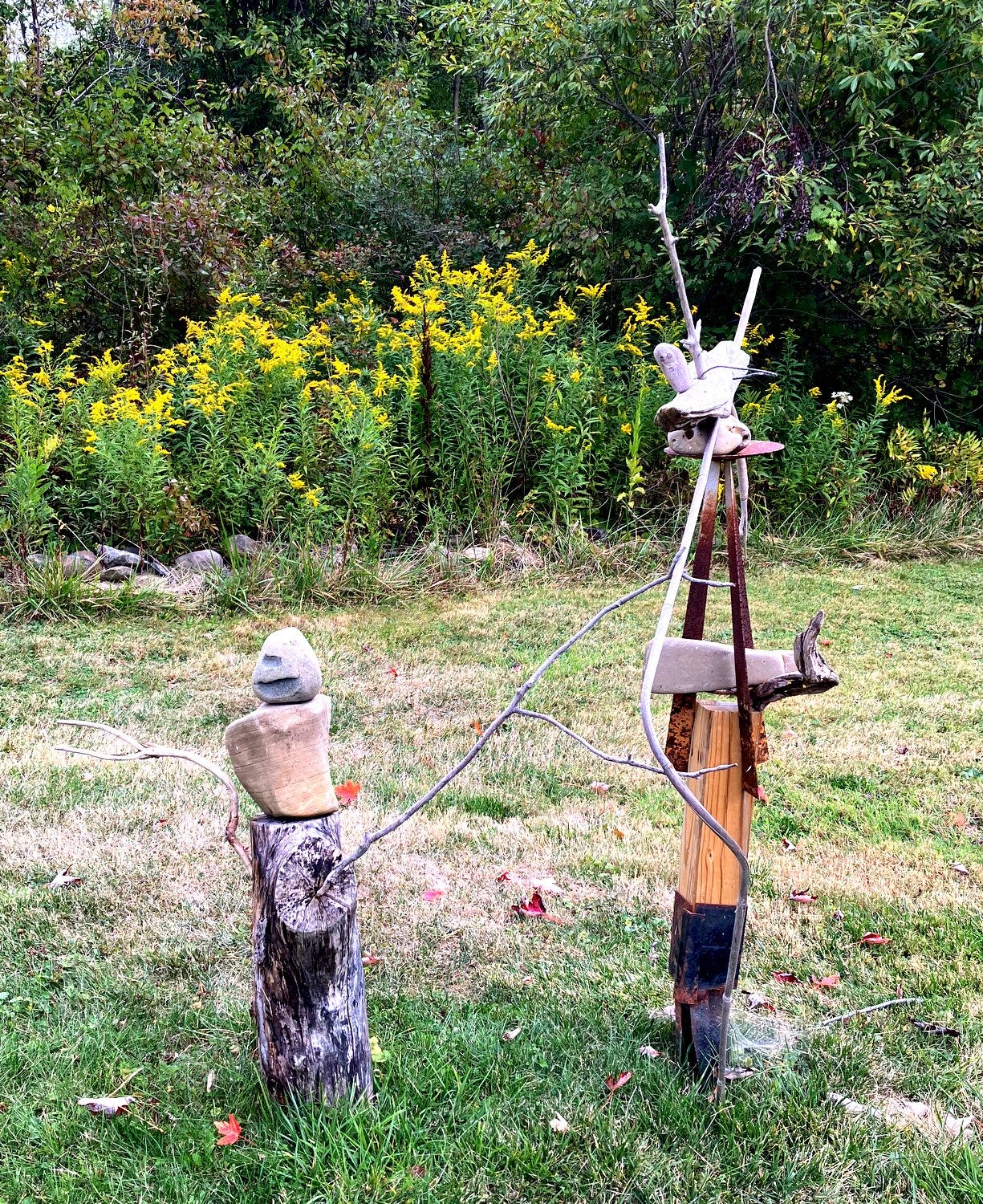 There was a time when our attention was pulled out the window rather than onto the manufactured allure of the screen. I often look out my window at Tim’s assemblage of found sticks, stones, and objects that are held together precariously without glue or hardware. Birds and Squirrels often perch on top. I watch in awe, as they manage move on and off without knocking it all apart. Nature seems to hold a sense of harmony that humans continue to strive for.