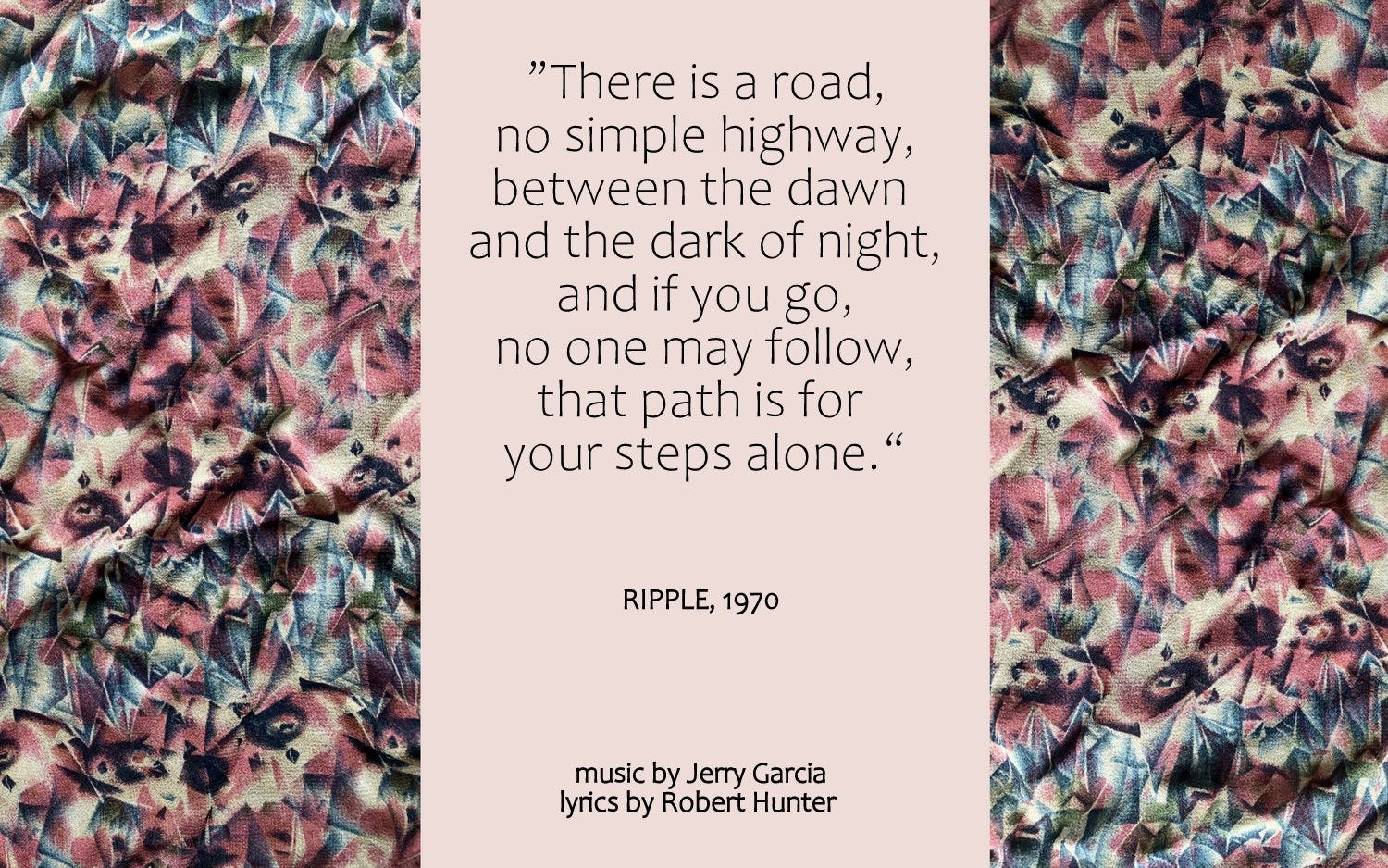 A humble California band began playing together in the 1960s. Their young teenage member, Bob Weir, recently died at age 78. One founding member of The Grateful Dead band remains (Bill Kreutzman), but Jerry Garcia left early in 1995, Phil Lesh died in 2024. Now the “kid” of the band is gone too. The music and mythology of Grateful Dead will remain a treasure in the hearts of fans. My own connection began as a college student in 1972. I had a boyfriend who was a self-proclaimed Deadhead, a term that made me cringe, even back then. Still, I dove in headfirst when I discovered how the art of music could inform my visual art.