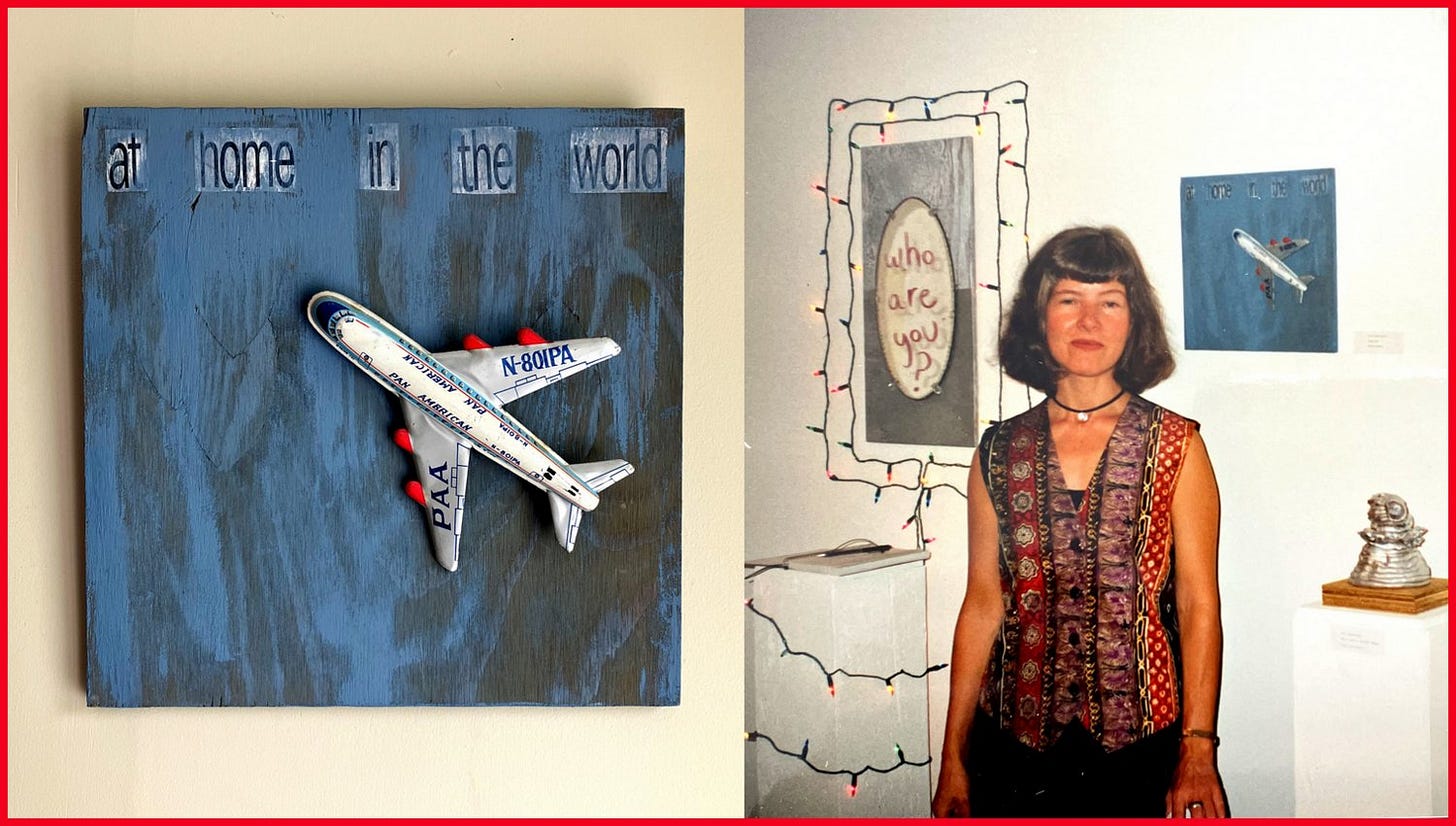 It was 1993 when I created an art installation for a group show at Boulder Art Gallery. The work began with a visit to a vintage curio shop where I found a tin toy plane and a pretty oval mirror that became central elements—along with plywood bases, words cut from a magazine, acrylic paint, red lipstick on the mirror and a string of colored lights. That mirror later turned up in my memoir.